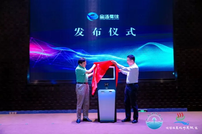 中國(guó)旅游協(xié)會(huì)溫泉旅游分會(huì)會(huì)長(zhǎng)黃志敏、秘書(shū)長(zhǎng)張?jiān)焦餐瑸榈谝慌_(tái)金湯易住揭幕。